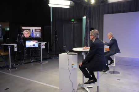 Jean-Paul Forceville and Philippe Wahl at Le Groupe La Poste, Paris watch Thierry Breton, European Commissioner for the Internal Market address the BRT by video link from Brussels