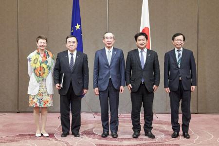 Patricia Flor, Ambassador of the European Union to Japan; Hiroshi Kajiyama , Minister of Economy, Trade and Industry; Masashi Sakuyama, BRT Japan-side Chairman; Eiichiro Washio, State Minister for Foreign Affairs and Mabito Yoshida, Vice Minister for Trade Policy, Trade Policy Bureau (MIC) mark the Handover of the BRT's recommendations. |