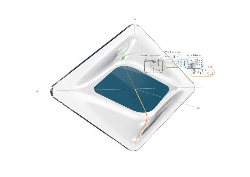 It has a central area that can be both transparent and opaque and able to integrate different PV cell technologies and colors. Central area is designed to be rotated at specific angle for each module to control both performance and aesthetic.