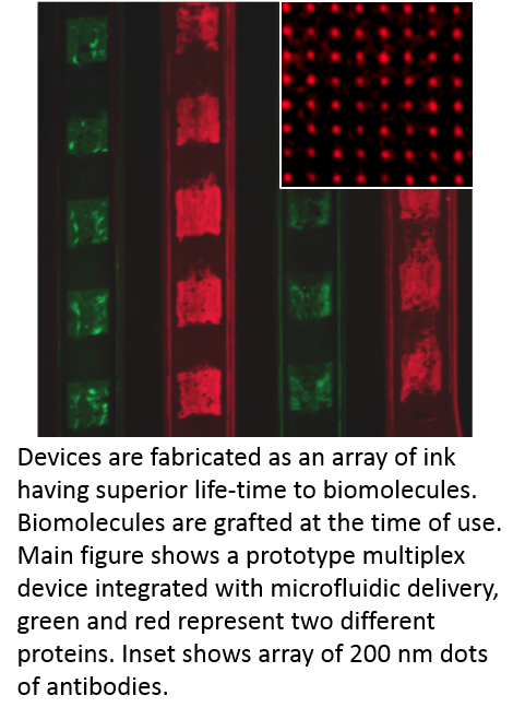 Patterning of stable chemicals as binding/grafting sites for biomolecules at the nanometre scale. This technology benefits from extended shelf-life, high throughput and low cost. Biomolecules are grafted to the pattern when the assay is performed. Biomolecule targets include proteins and DNA.
