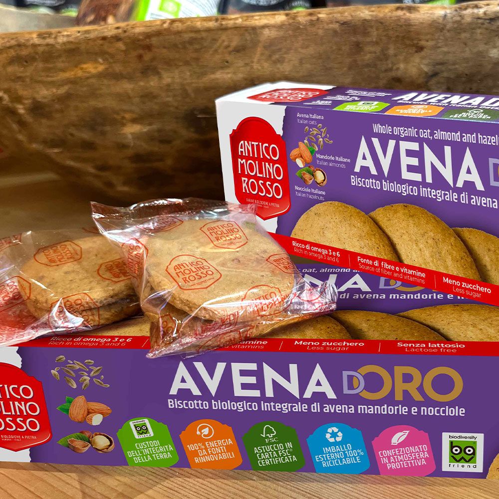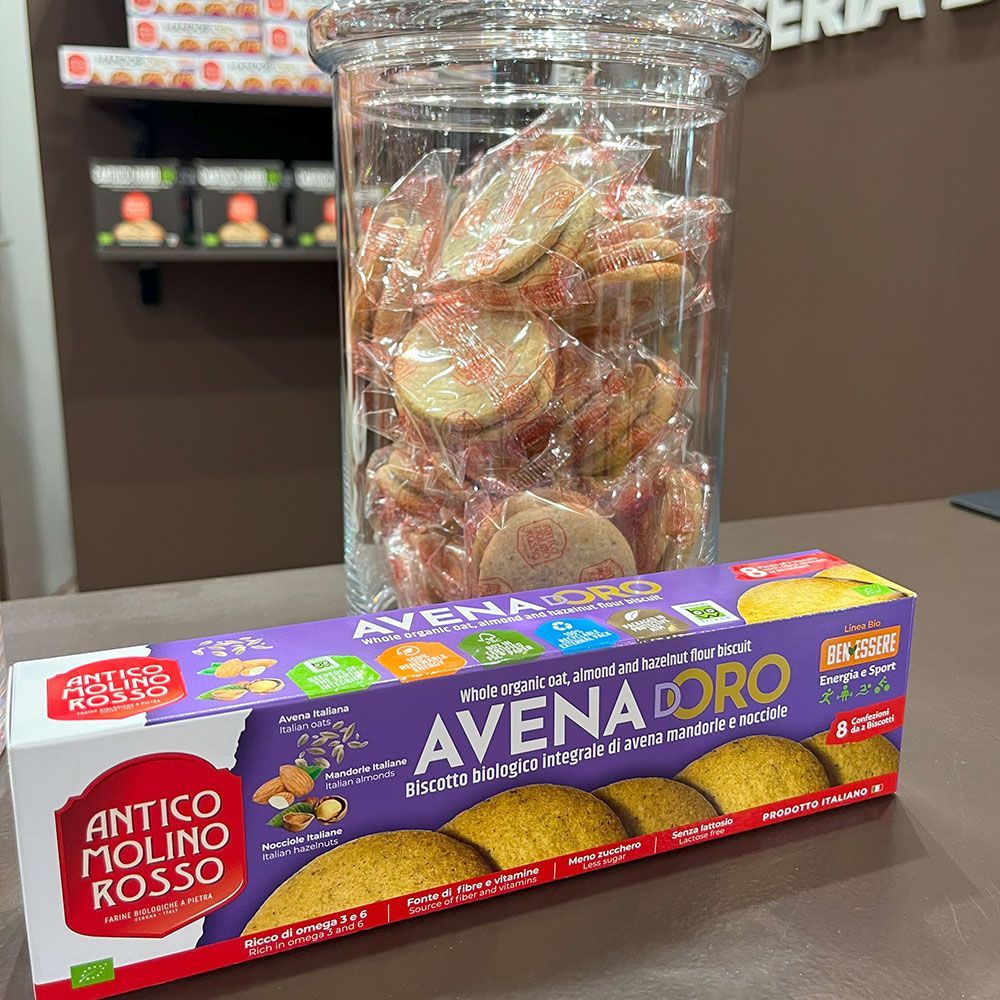 Italian organic product. It is an organic biscuit made with whole oat, almond and hazelnut flour. Rich in omega 3 and 6, source of fiber and vitamins, less sugar, lactose free. Packaged as single portions, the box has sixteen pieces and the net weight is 160 g. It is perfect for sports people. The oat is a source of energy. You can always carry with you. Enjoy as a snack alone, with your favorite drink or at breakfast in the morning.