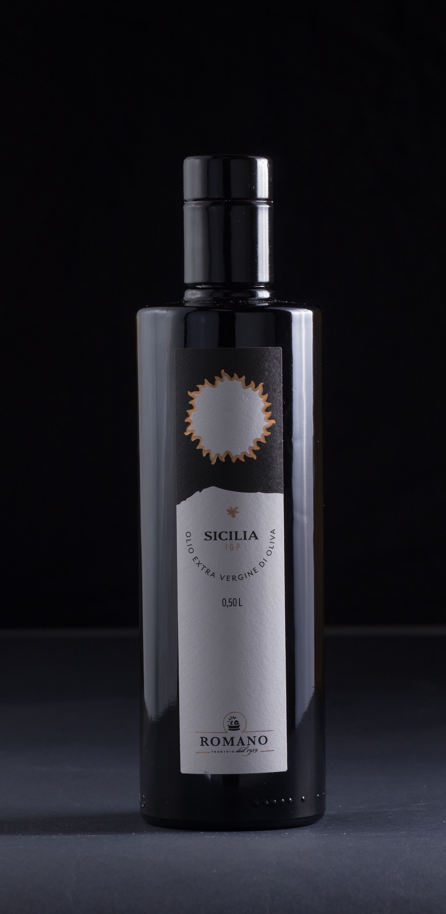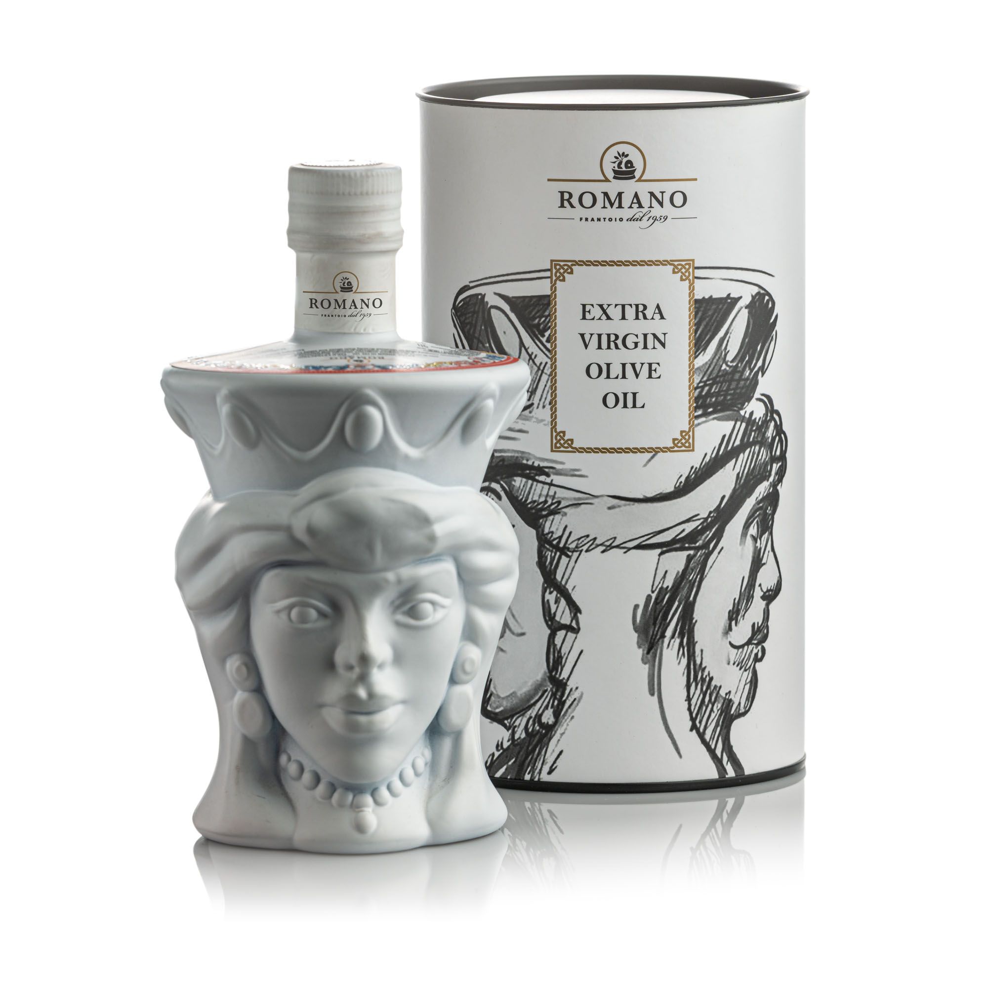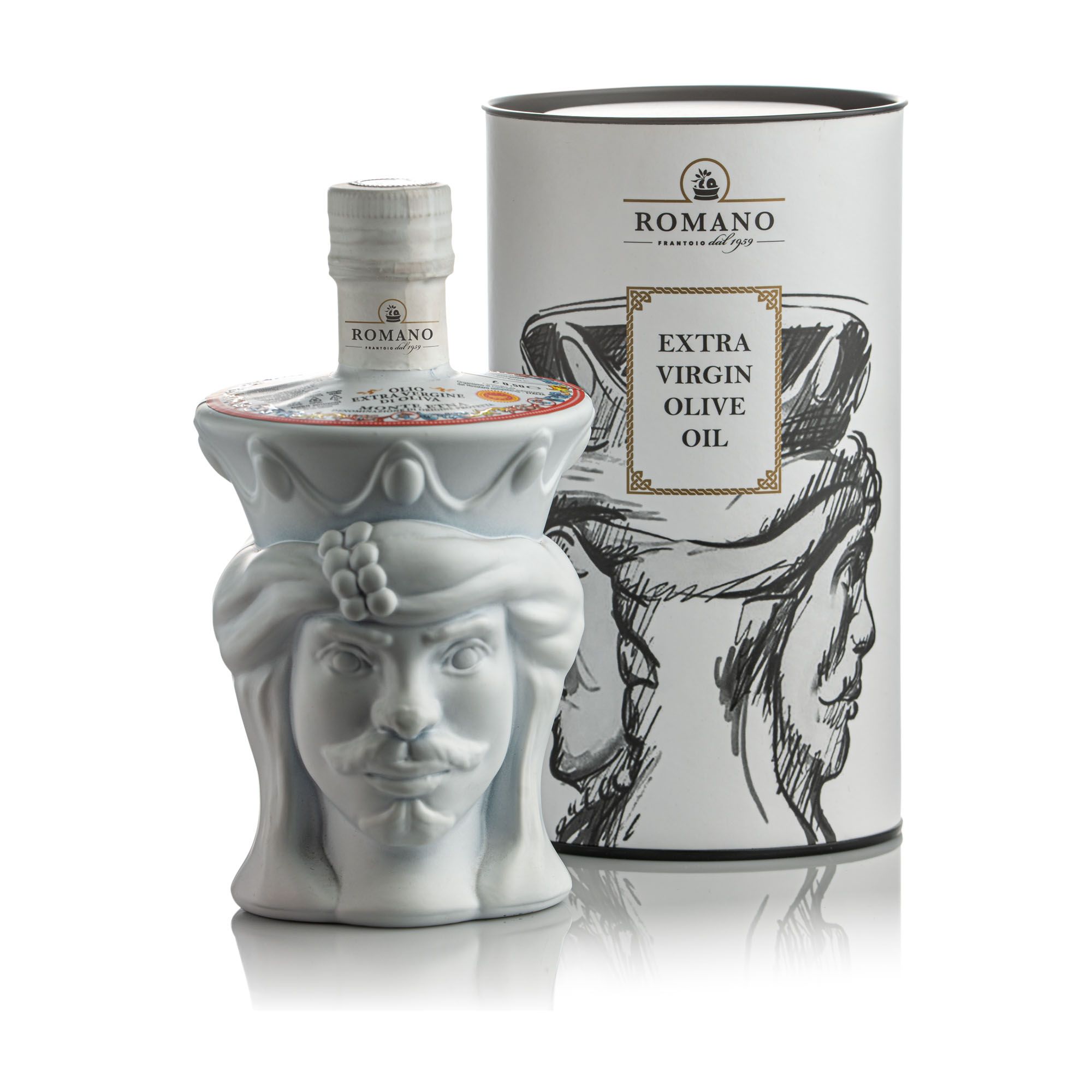 Extra Virgin Olive Oil obtained from native Sicilian olive varieties subjected and controlled by IRVOS (Regional Institute of Wines and Oils of Sicily) - up to packaging in numbered bottles with special Testa di Moro design, exclusively produced by Frantoio Romano for their customers .