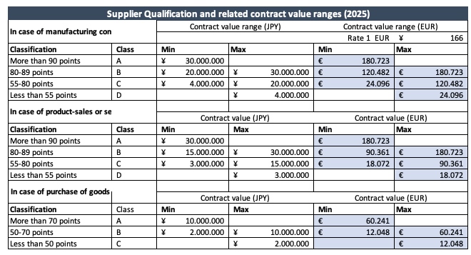 The chart below shows the classification and contract value ranges applied by procuring entities using the Unified Supplier Qualification System. Other procuring entities will use similar classifications. If you wish to calculate ranges with other EUR/JPY exchange rates, please use this Excel sheet.