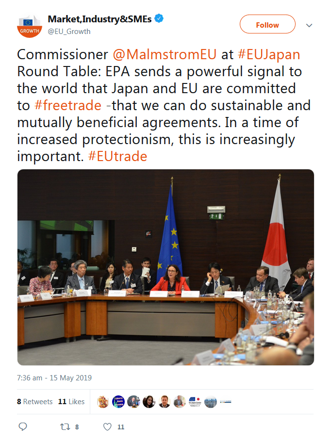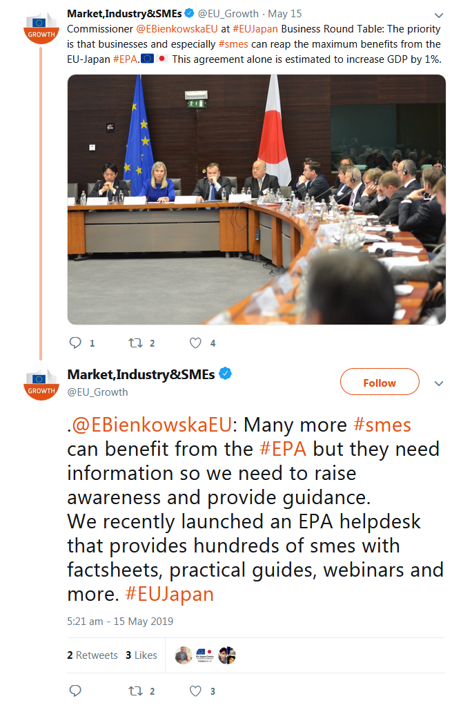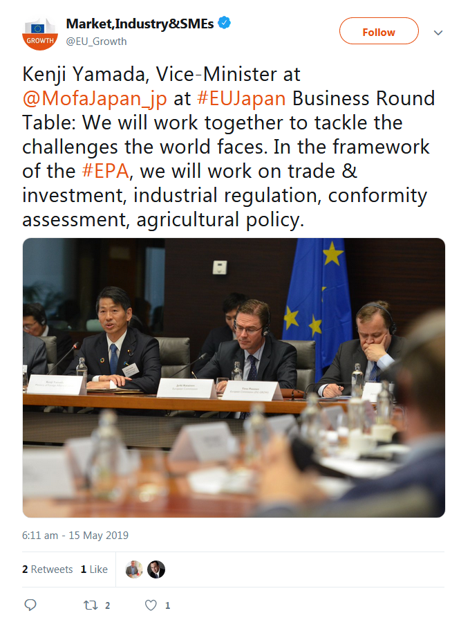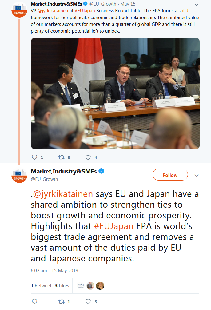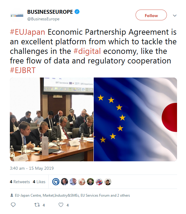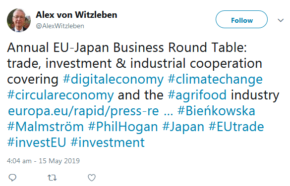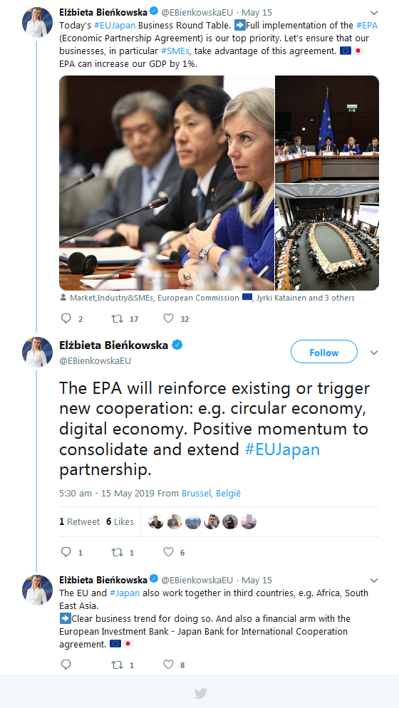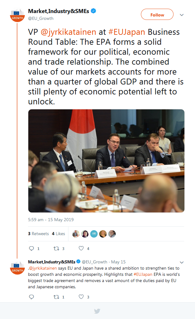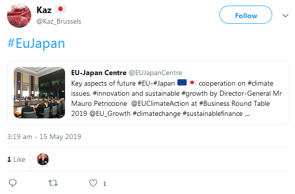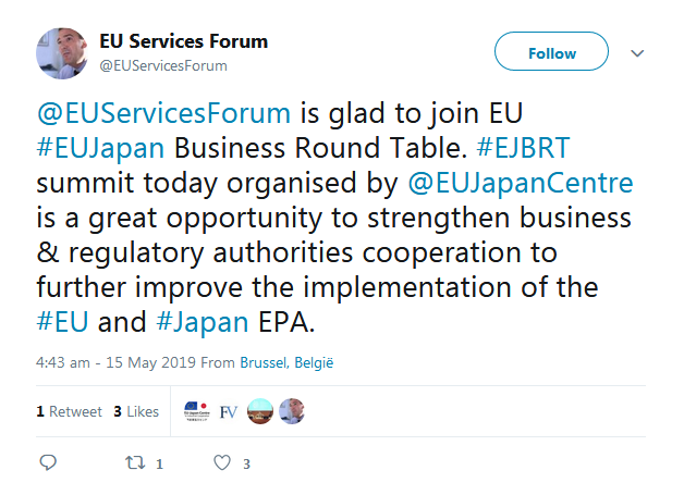 A selection of the tweets sent by the European Commission, Government of Japan, BRT member companies, the BRT Secretariat at the EU-Japan Centre for Industrial Cooperation, and others can be found below.