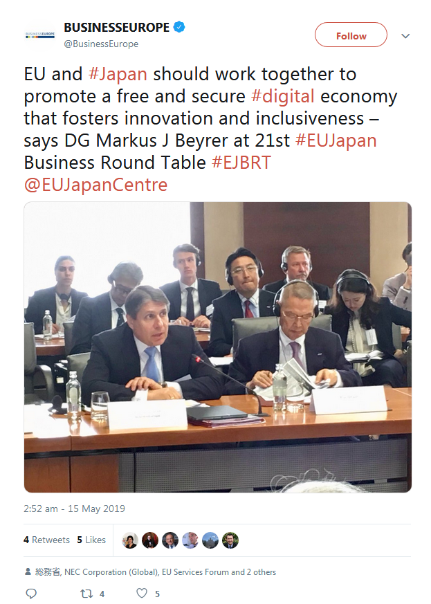 2019年5月15日(水曜日)に、ブリュッセルにあるエグモン宮殿で第21回ビジネスラウンドテーブル年次会合が、開催されました。当会合は多くのメディア(ソーシャルメディア含む)にて報道されました。