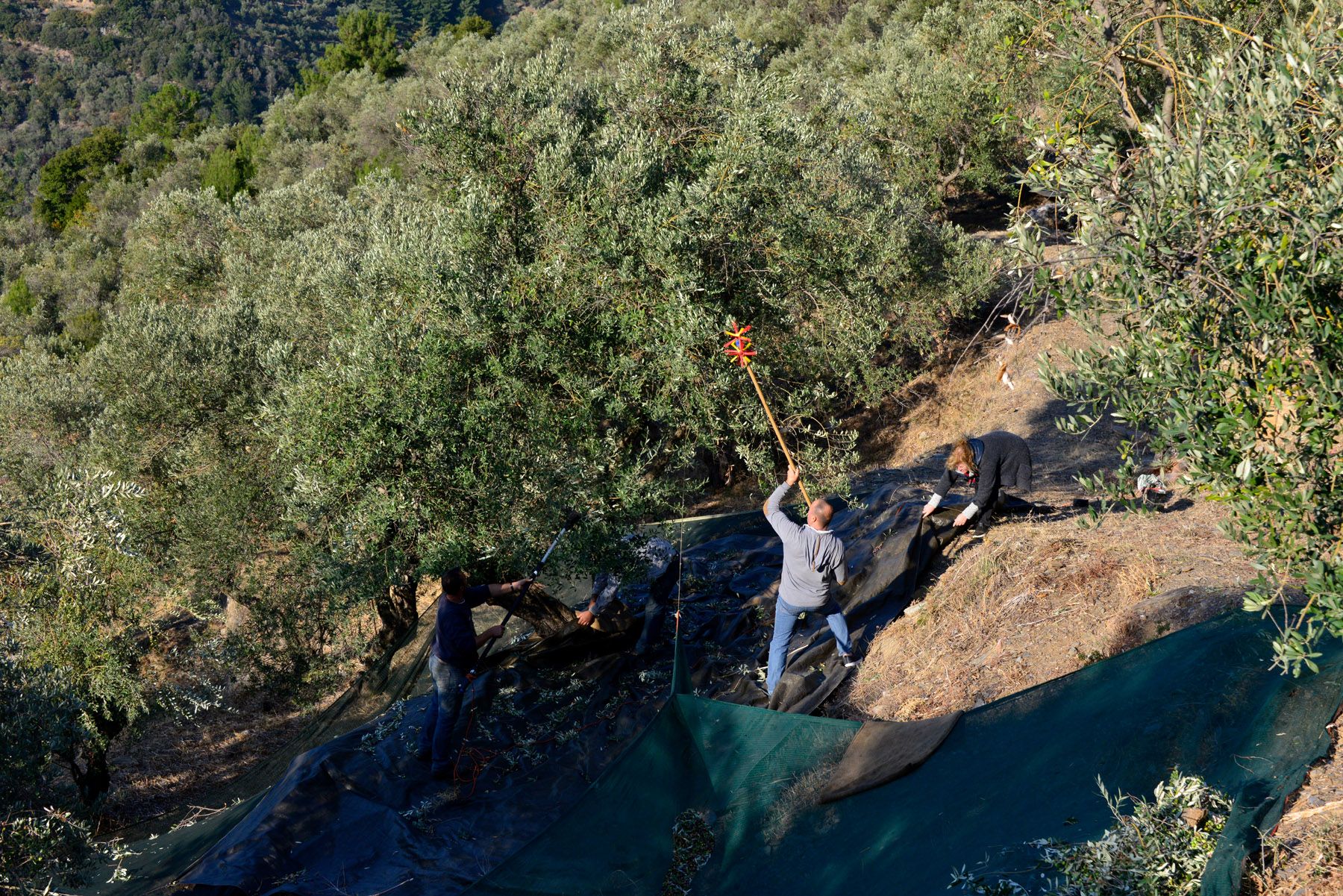 オリーブの収穫は11月初旬に始まります。まだ完熟していないオリーブを丁寧に手摘みし、地面に落とすことなく枝から直接摘み取っています。私たちの目標は、オリーブの実を収穫したその日のうちに、完全な「完熟」ではなく、完璧なフレッシュさとジューシーさを持った状態で圧搾機に届けることです。地面に落ちたオリーブは、私たちの農園を住処とする鳥や動物たちへの贈り物となります。