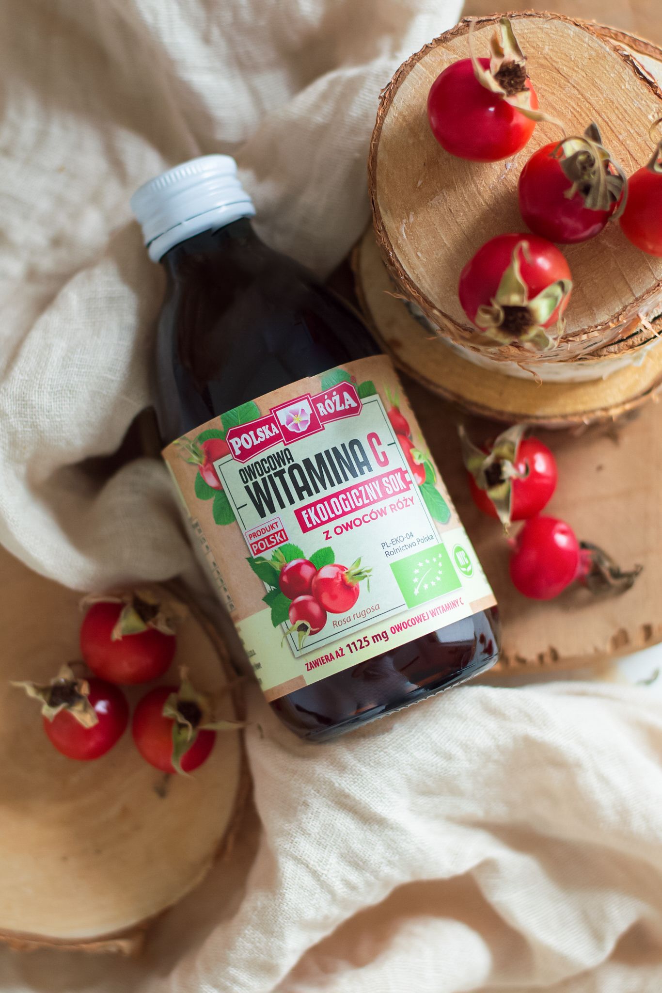 地元ポーランドの有機農家で栽培された新鮮なローズヒップを手摘みし、圧搾してジュースにしました。このようなシンプルな工程が、ジュースの品質の高さにつながっています。各ロットの製品のビタミンC含有量はチェックされ、製品ラベルに表示されています。