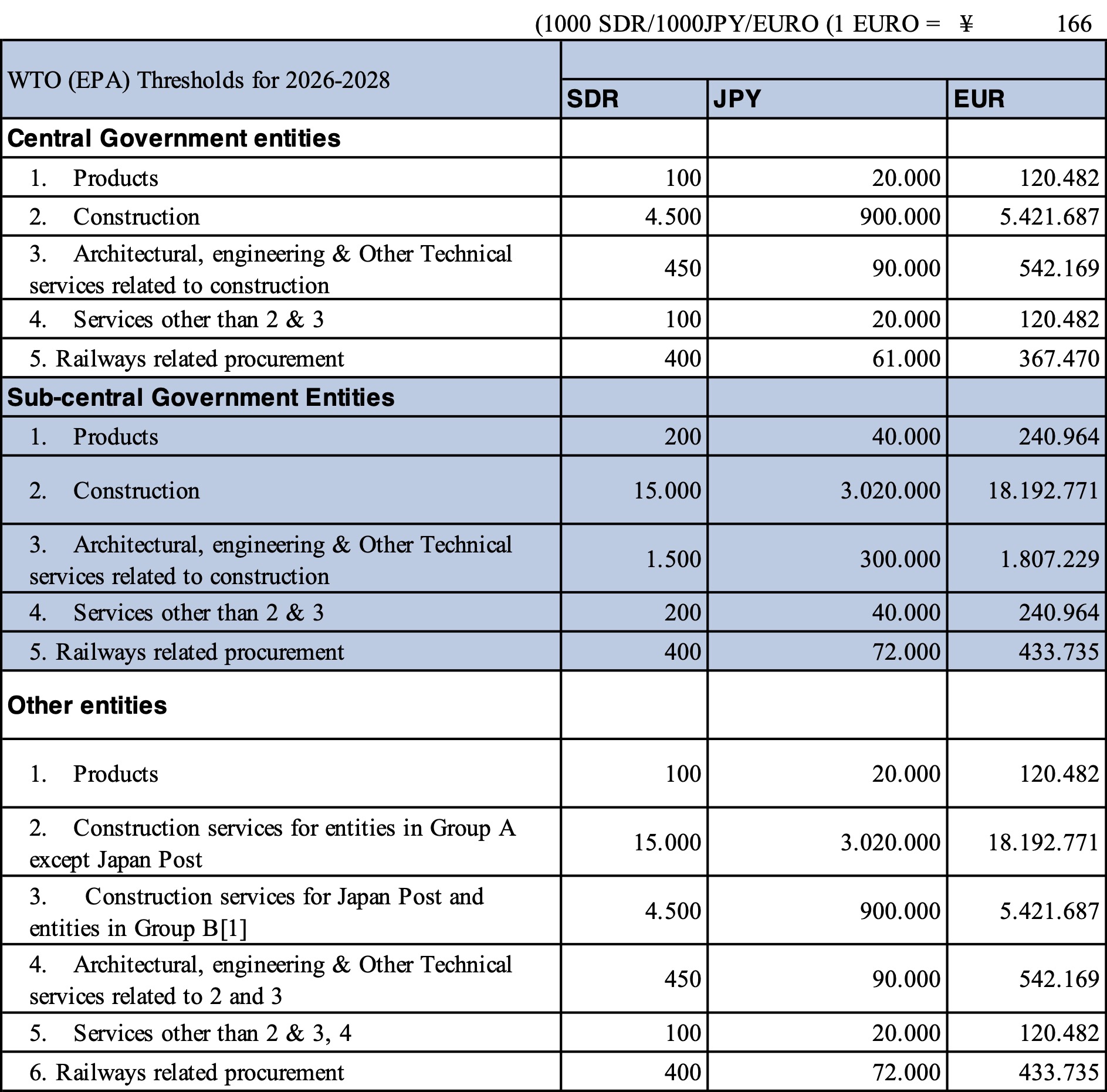Based upon the official exchange rate for the Euro currently used by the Japanese government (€1,- = ¥166,-), the threshold for central government contracts will be close to €120.000,- for goods and services contracts. At the sub-central level, this will be double the amount at closed to €241.000,-