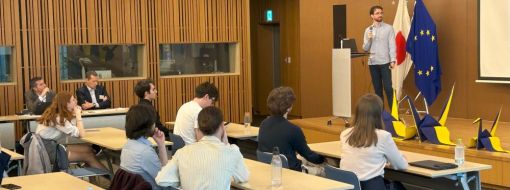 Vulcanus in Japan 2023/24 students gathered at Europe House in Tokyo for the Midterm Presentation on 26 April. The 16 participants of the Vulcanus in Japan programme arrived in Japan in September 2023 and started their 8-month internship in Japanese host companies in January 2024. After the first 4 months, all of them successfully completed the Midterm Presentation, signifying the transition into the second part of the Vulcanus programme.